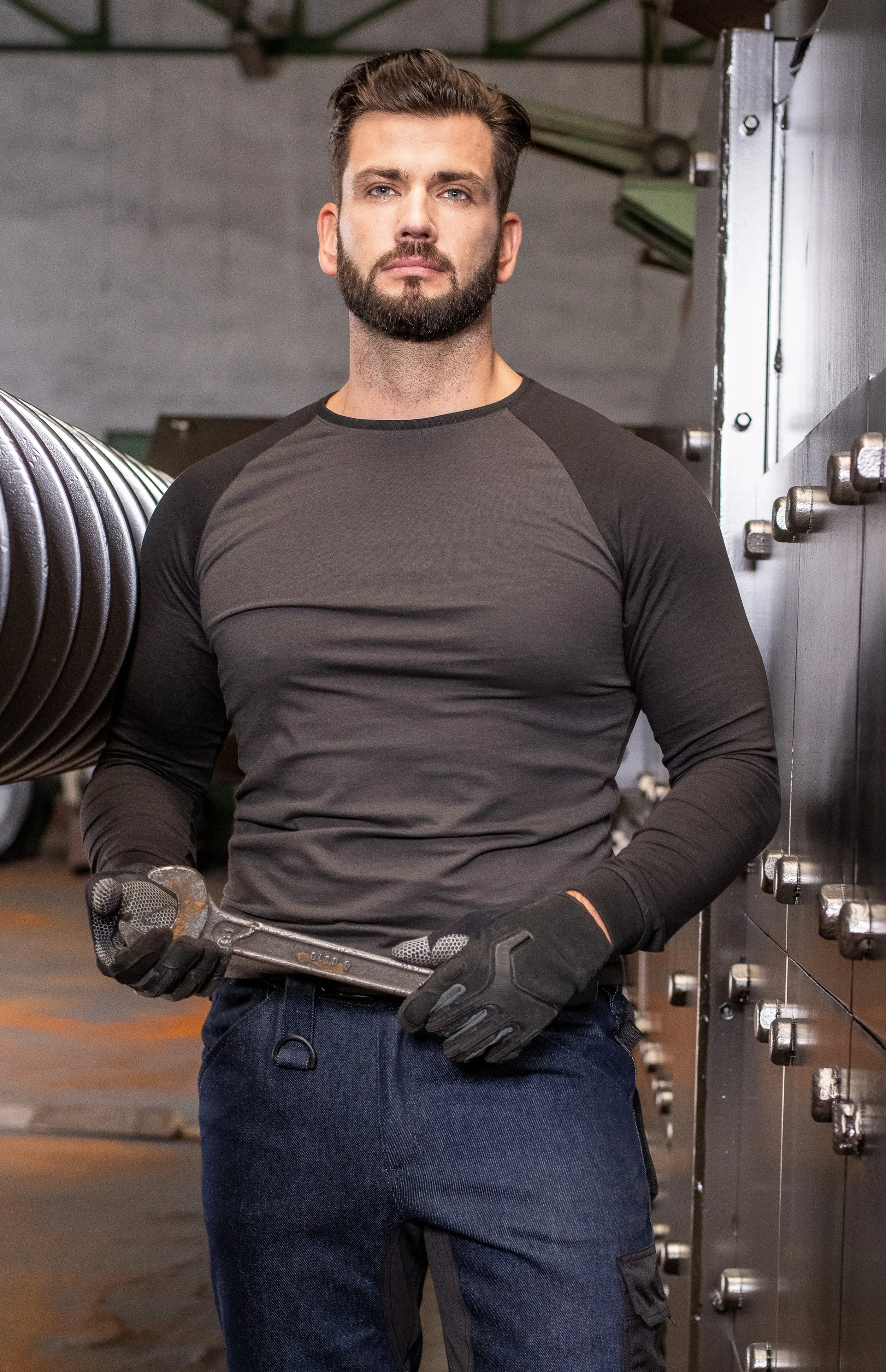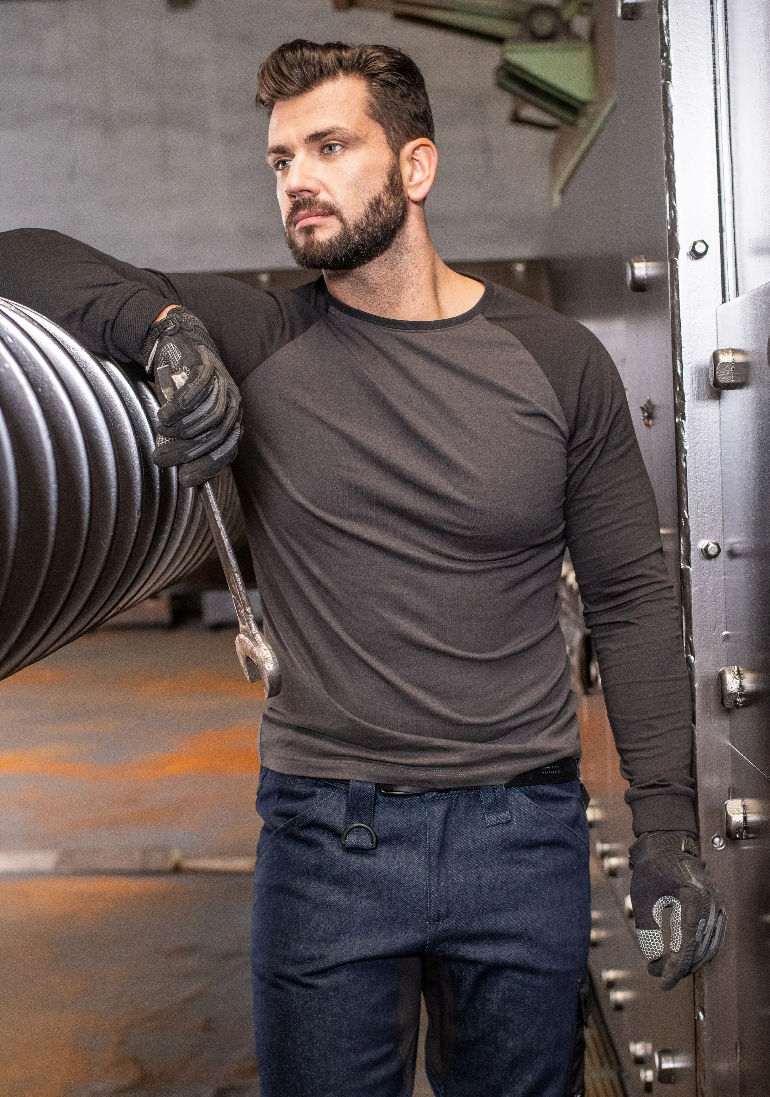 Herren Kontrast T-Shirt mit langen Ärmeln, Ebenholz Grau, 3XL